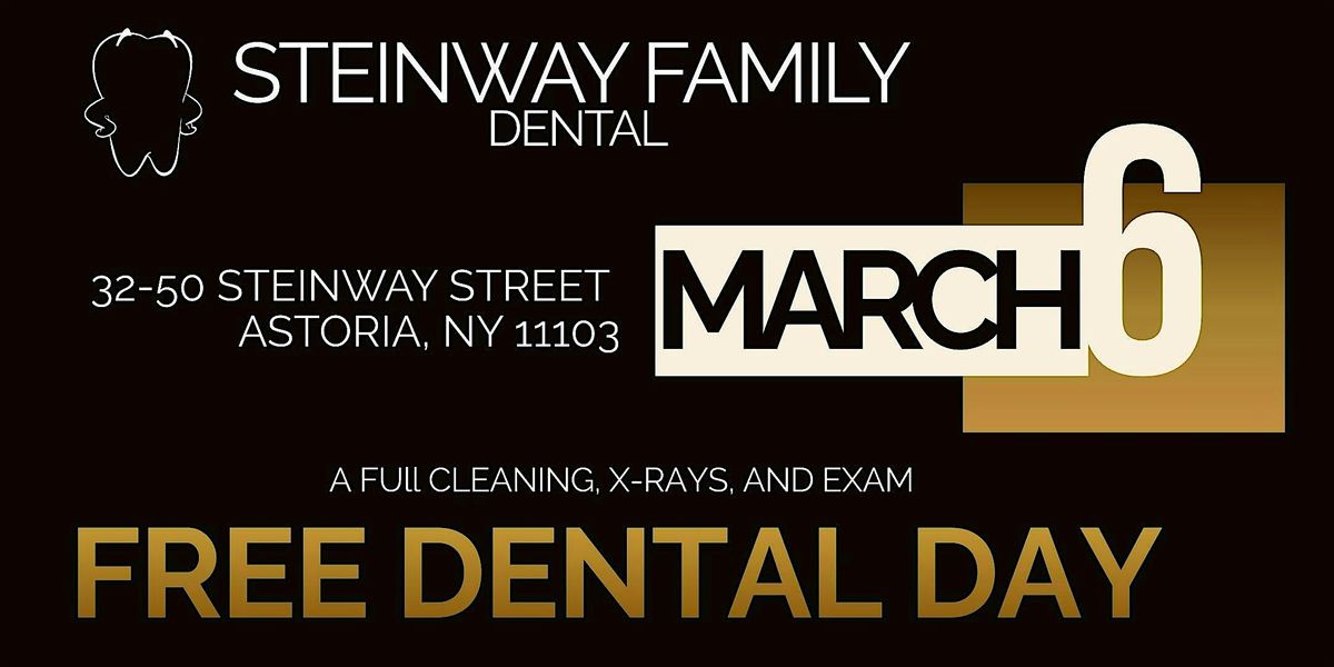 Join us for a day of health and wellness at Steinway Family Dental Center! We're offering FREE dental cleanings everyone who registers online. Get ready to brighten your smile and learn some great dental tips. You are welcome to bring your friends and family over the age of 18 – we’re here to make your visit easy, fun, and super welcoming. See you there!