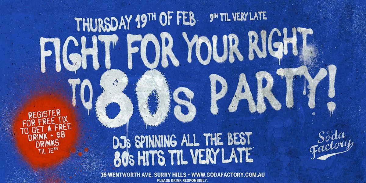 Fight For Your Right To 80s Party is Sodaβs full-blown throwback dancefloor takeover, bringing you wall-to-wall 80s bangers! Our DJs are spinning the very best of the decade til very late - from pop anthems and rock classics to guilty pleasures you still know every word to.