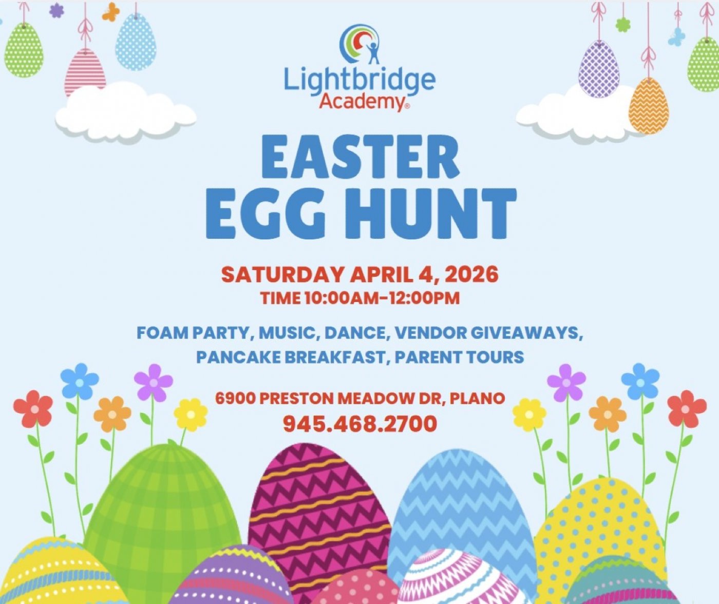 Come, join us for an Easter Egg Hunt celebration with a Foam Party that is safe for children of all ages. This is a FREE EVENT. We will have a pancake breakfast, music, games, giveaways, parent tours and more.