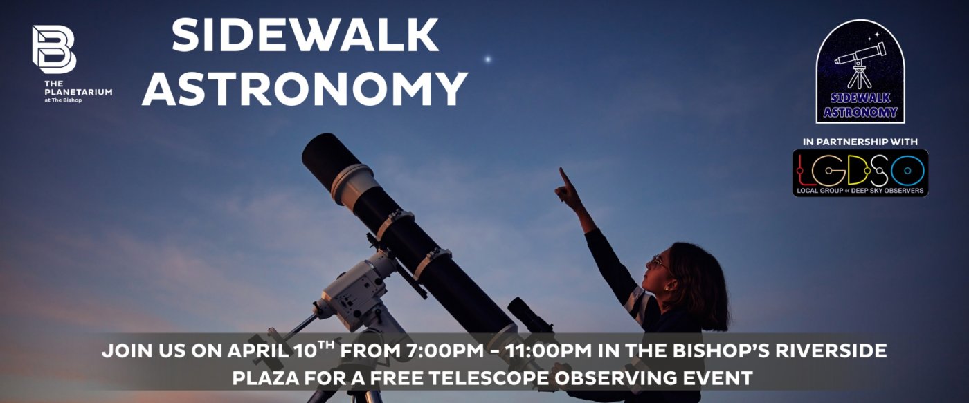 We have partnered with the Local Group of Deep Sky Observers (LGDSO) to bring Sidewalk Astronomy to The Bishop. At this FREE event, you’ll have a chance to see planets, moons, and maybe some deep-sky objects through powerful telescopes. FEWD Tent, Edible Cookie Dough Cafe, Smiley Face Cafe, and Clementines will be here serving tacos, coffee, sandwiches, and treats. Drinks, including water, soda, wine, and beer, will be available for purchase.