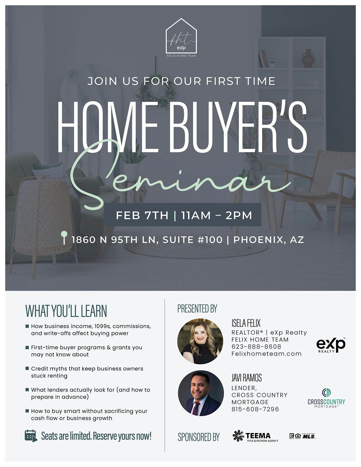 The Felix Home Team will be in attendance along with one of our preferred lenders as well as Teema Title and Escrow Agency