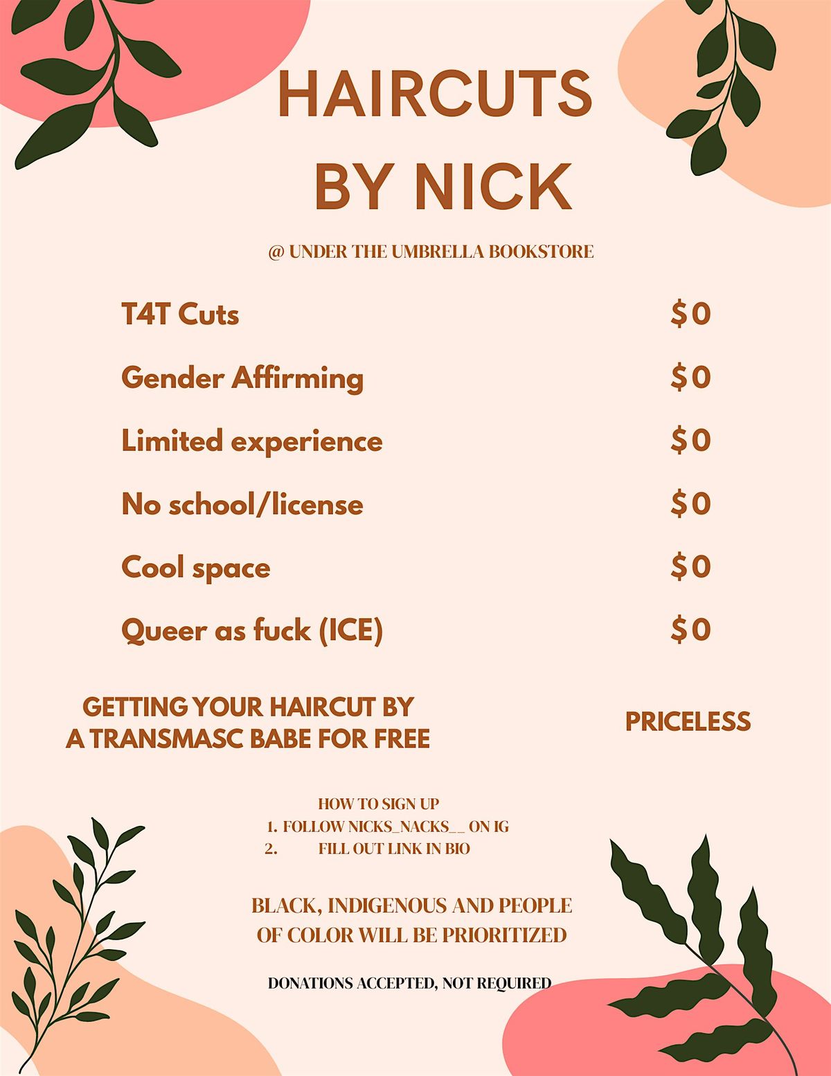 Free short haircuts from Nick Arteaga! Tips and donations accepted but not required.