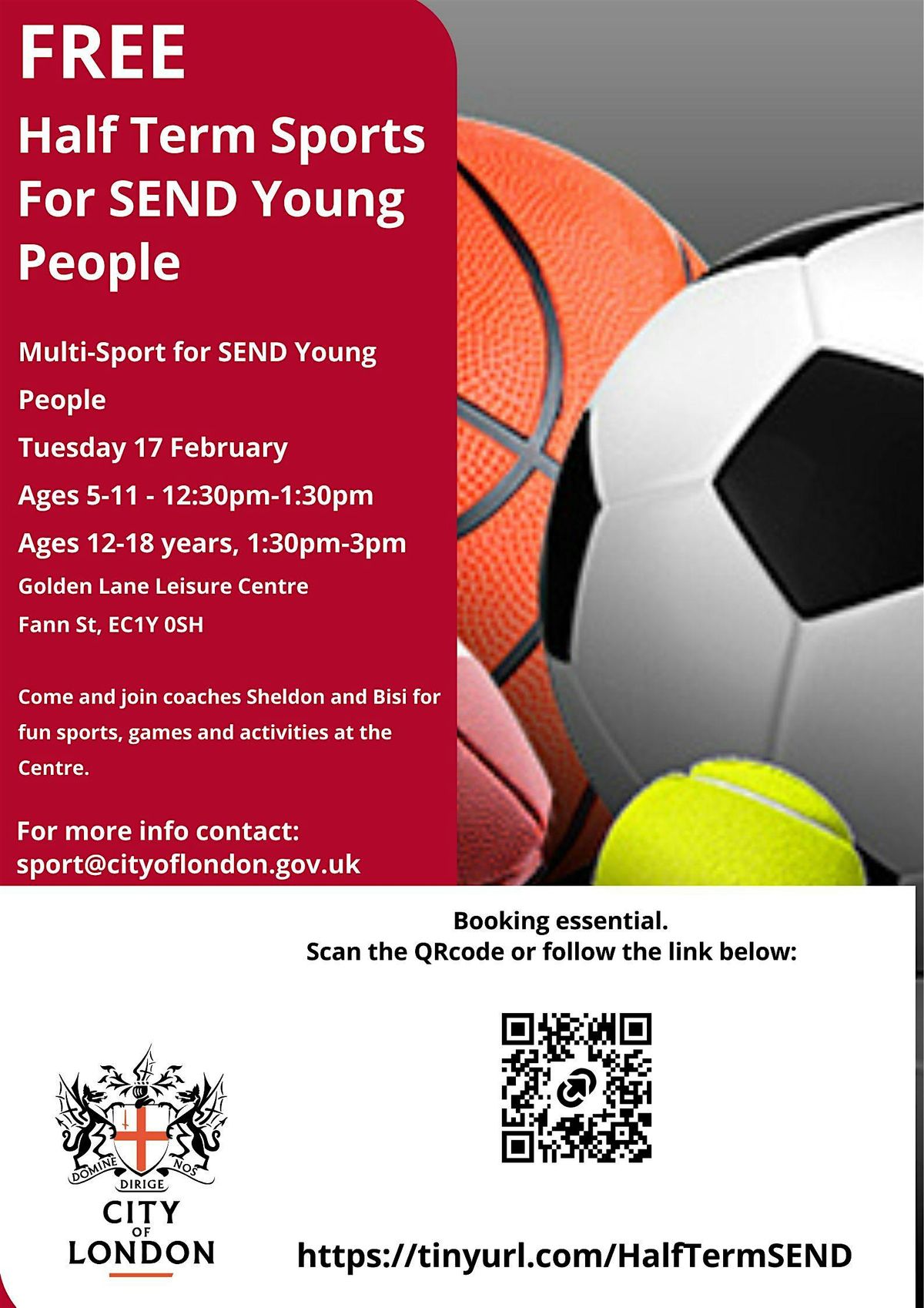 Welcome to our **FREE Half Term Sports Activities** for **SEND Children** aged **5-11 Years at 12:30pm and 12-18 years at 1:30pm **! Join us at the Golden Lane Leisure Centre on **Tues 17th February 2026** for a fun-filled day of sports and games tailored specifically for children with special educational needs and disabilities. Our activities are designed to be inclusive and accessible to all, ensuring that every child can participate and have a great time. Don't miss out on this fantastic opportunity to engage in physical activity, make new friends, and have a blast! See you there!