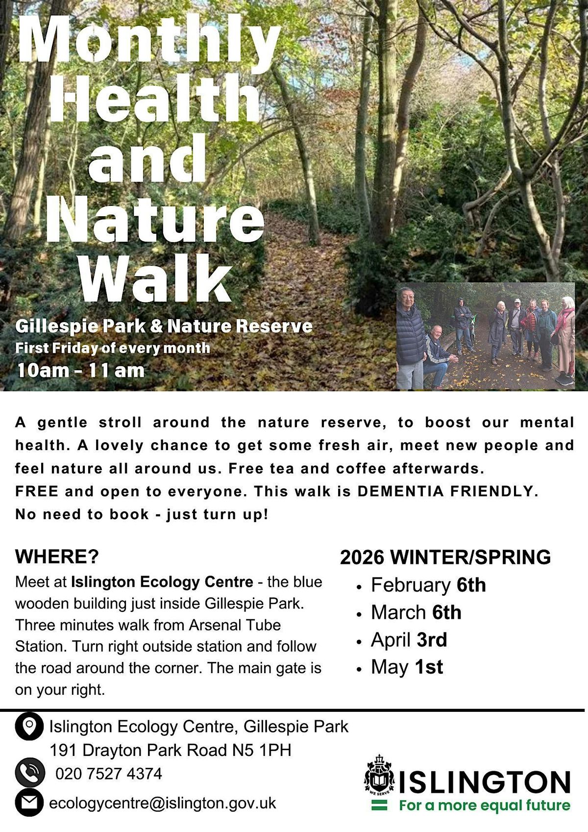 Get ready to explore Gillespie Park and Nature Reserve! This is a perfect chance to breathe in fresh air, enjoy some gentle walking, and discover the wonders of nature around you. Whether you’re a nature newbie or a wildlife enthusiast, everyone’s welcome. Come along, meet new friends, and boost your health in a relaxed setting. Free teas and coffees afterwards. Open to all ages. Also Dementia friendly.