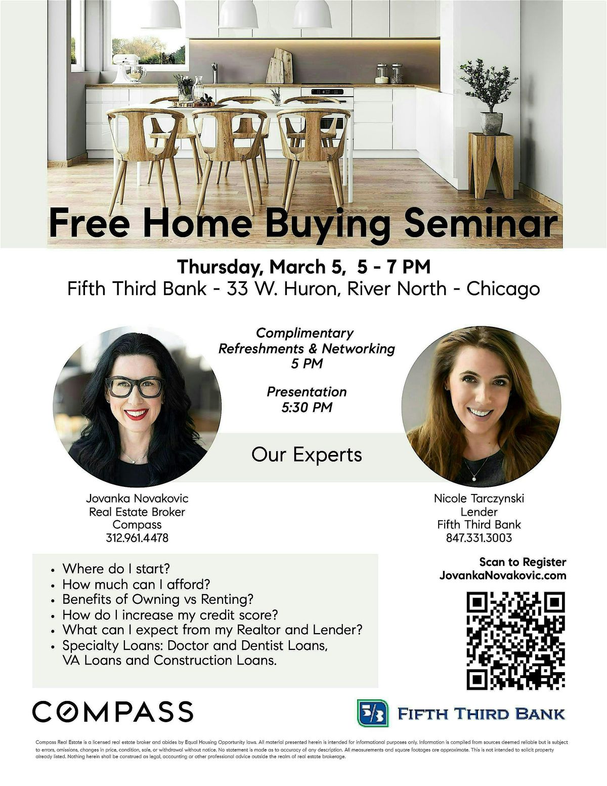 Our real estate experts Jovanka Novakovic, Real Estate Agent at Compass and Nicole Tarczyski, V.P. of Lending at Fifth Third Bank will answer your questions after a short presentation to share their knowledge, and help you achieve your dream of homeownership. Networking starts at 5 PM with complimentary refreshments for your enjoyment with a short presentation and Q & A to follow at 5:30PM. All are welcome!