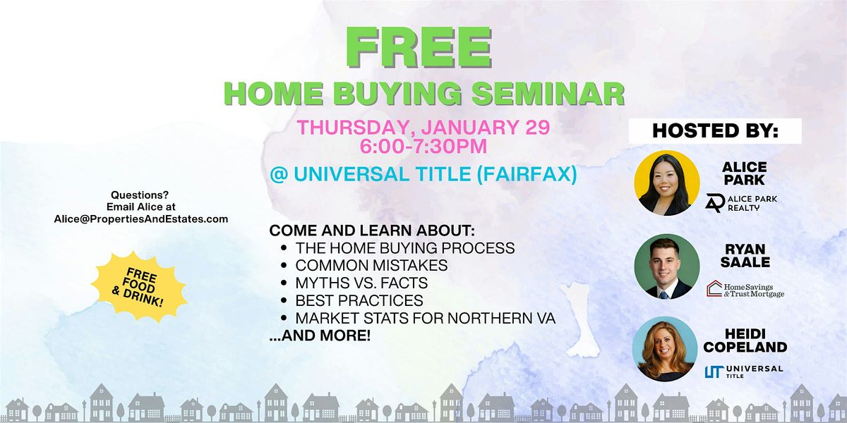Hosted by Alice Park (realtor), Ryan Saale (lender), and Heidi Copeland (title/settlement), this event is FREE and open to anyone who wants to learn about the homebuying process. Whether you're a first-time homebuyer or you've been through this before but would like a refresher, we hope to see you at our event on Thursday, January 29, at 6:00pm! Enjoy free food and drink as you learn about: