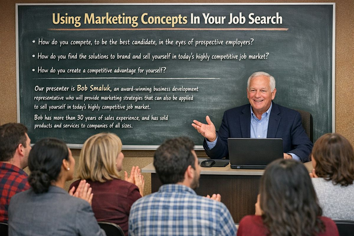 Our presenter is Bob Smaluk, an award-winning business development representative who will provide marketing strategies that can also be applied to sell yourself in today's highly competitive job market. Bob has more than 30 years of sales experience, and has sold products and services to companies of all sizes.