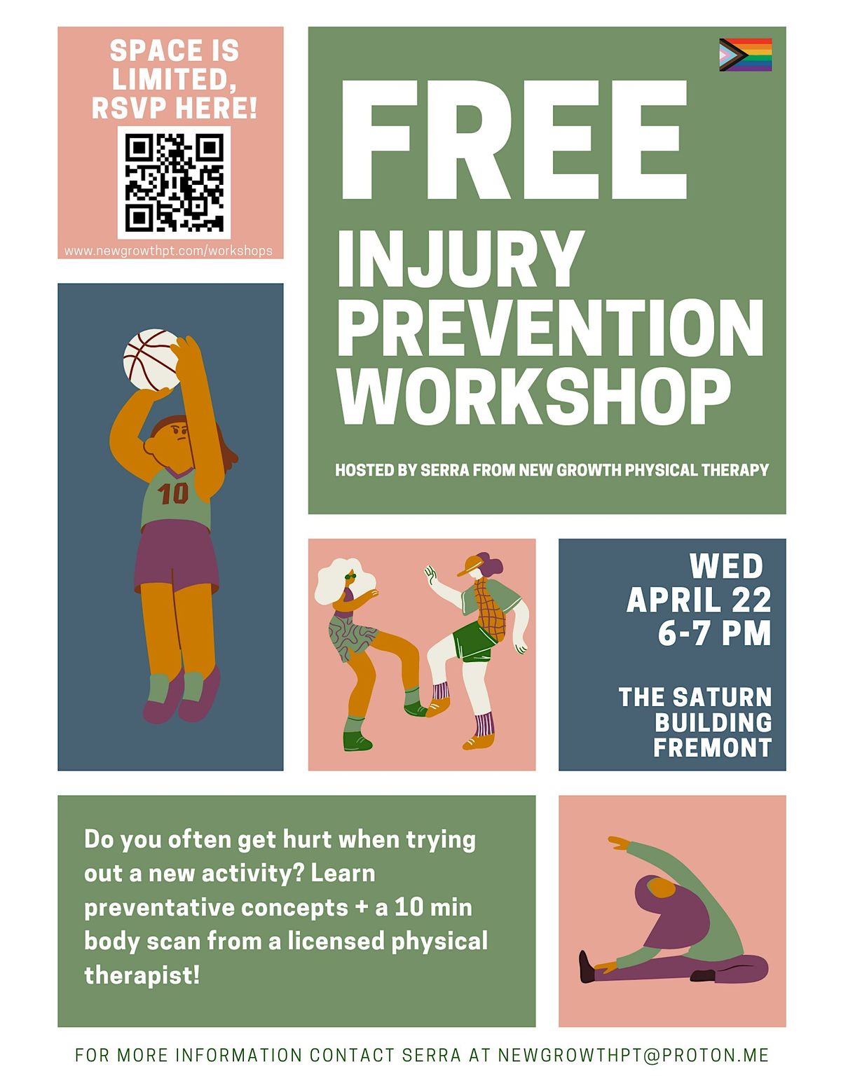 Do you often get hurt when trying out new activities? Learn the anatomy + physiology of soft tissue damage, preventative concepts, and a 10 minute body scan to fire stabilizing muscles and reduce your chance of injury. Whether you're an athlete, a weekend warrior, or just want to move better every day, this workshop is for you! Hosted by licensed physical therapist Serra Shelton, PT, DPT of New Growth Physical Therapy.