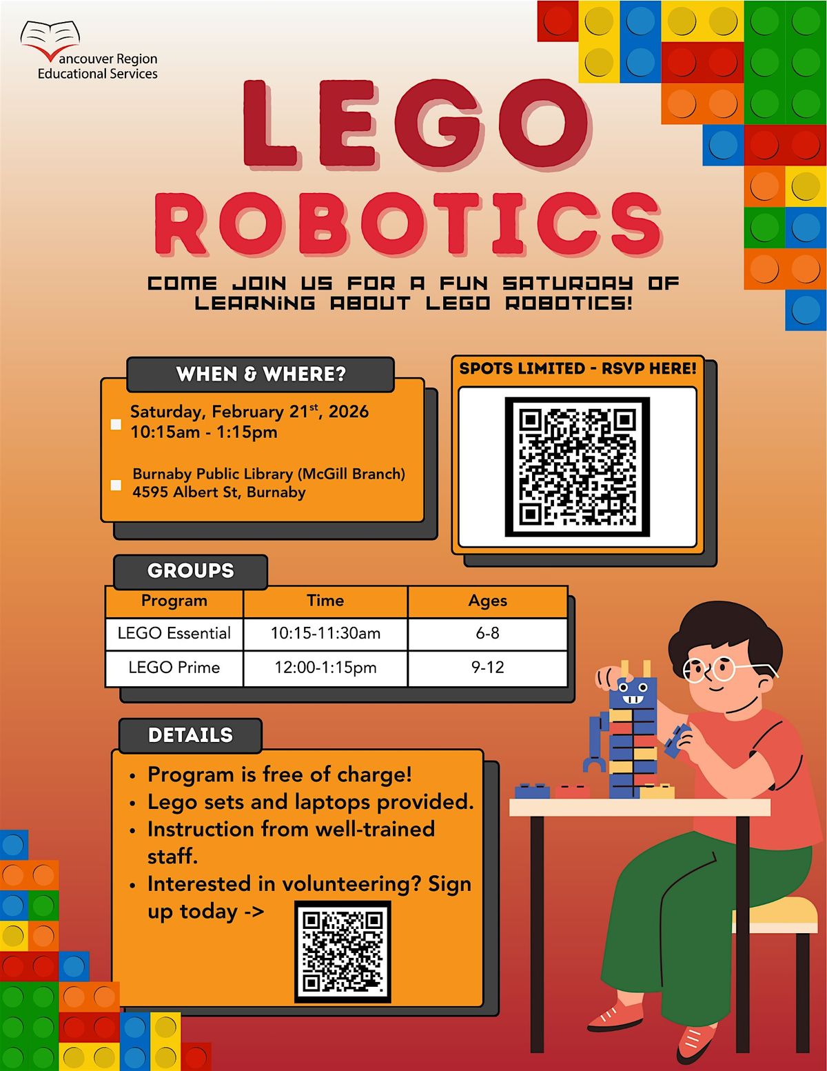 Vancouver Region Educational Services is proud to host our third free Lego Robotics event! All skill levels are welcome.