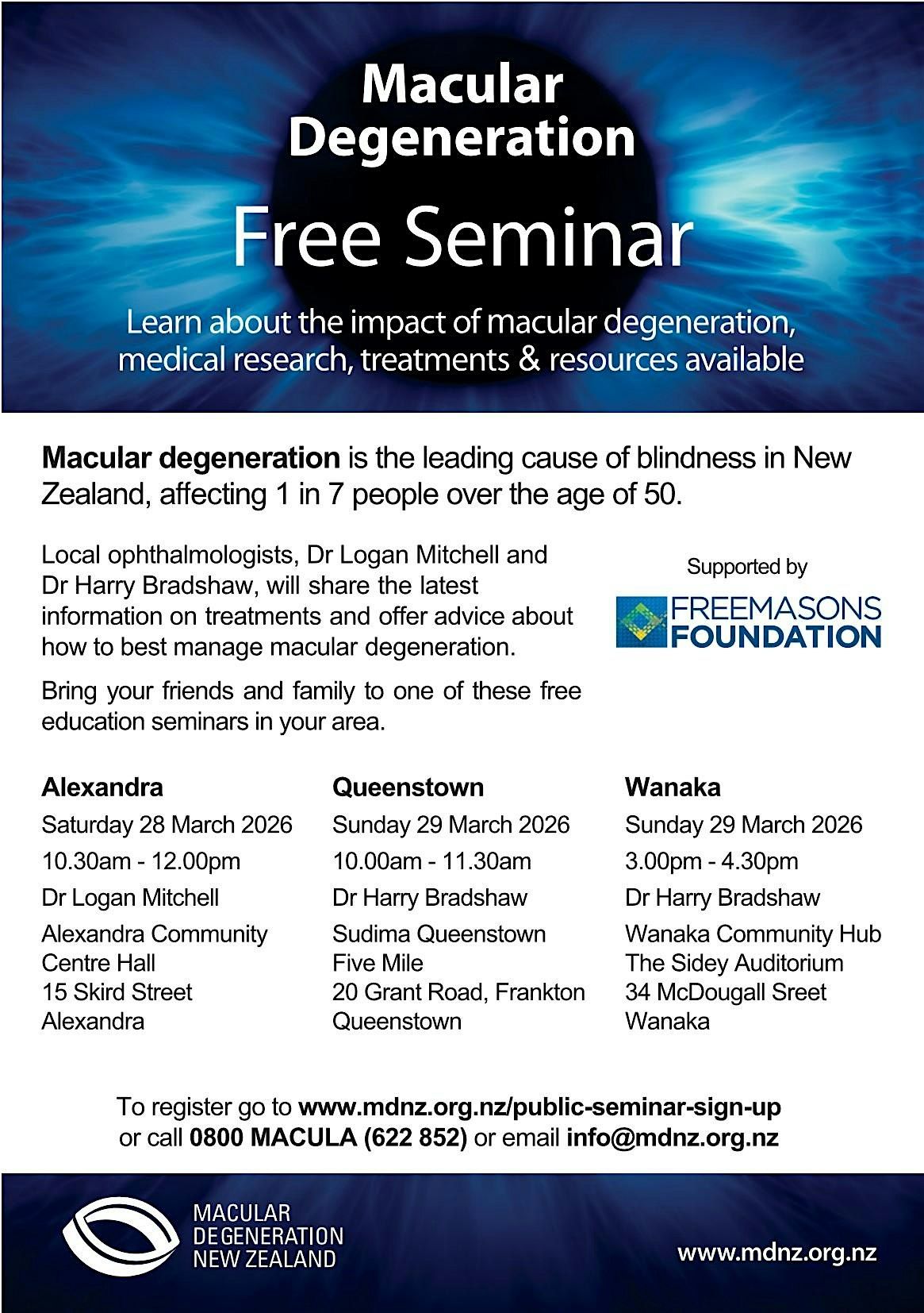 Ophthalmologist, Dr Harry Bradshaw, will share the latest information on diagnosis and treatments and will offer advice about how to best manage macular degeneration.