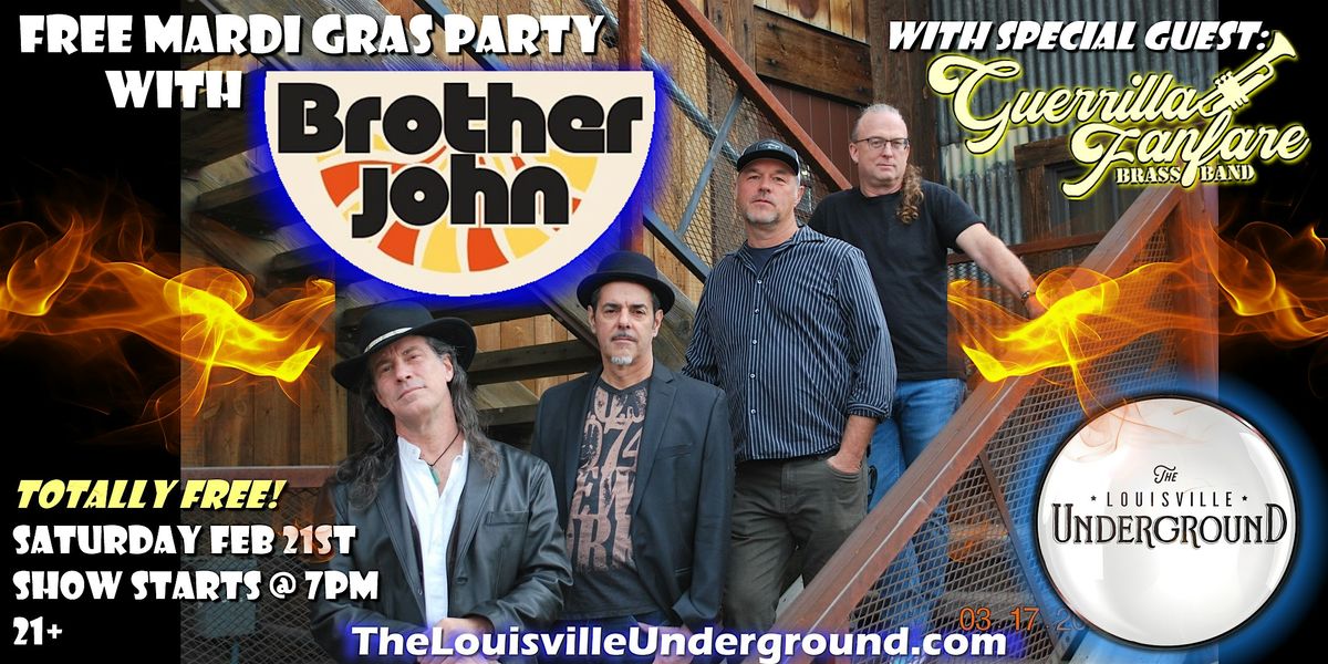 Your favorite Speakeasy is throwing a FREE, yes, TOTALLY free MARDI GRAS PARTY on Saturday February 21st! The fun starts at 7pm. Dress up, grab your friends and get ready for a wild night of music, dancing and drinks. The Guerrilla Fanfare Brass Band will be playing a few songs outside on the corner (weather permitting) around 7 and will lead a parade down into the venue and will be playing a full set! And THEN, we have BROTHER JOHN rocking the crowd till midnight! You will not want to miss this blowout event!!! No registration necessary. 21 and over only.