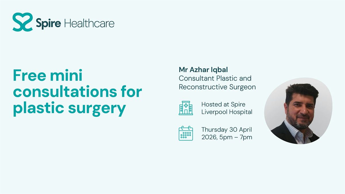 Join us at Spire Liverpool Hospital on Thursday 30th April for a complimentary opportunity to meet Mr Azhar Iqbal, Consultant Plastic and Reconstructive Surgeon, during our relaxed 15‑minute mini consultation evening, running from 5pm to 7pm.