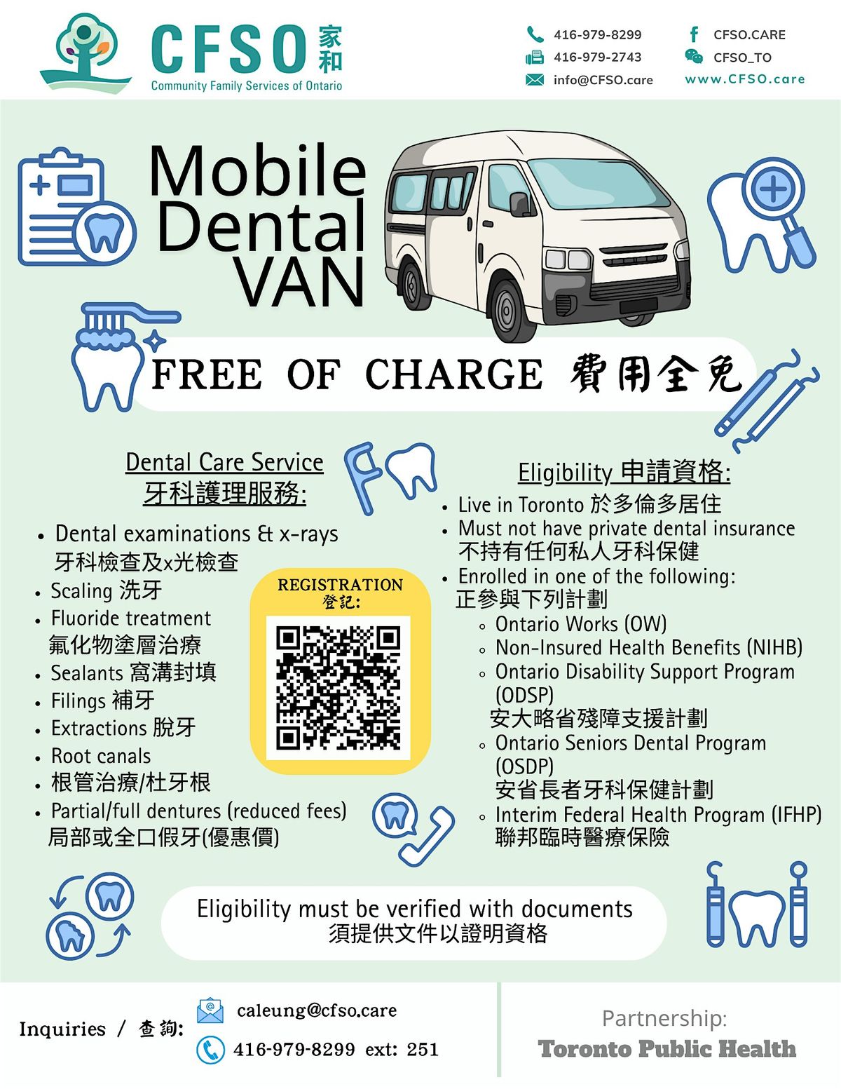 Welcome to the Free MOBILE DENTAL VAN! In partnership with Toronto Public Health, Community Family Services of Ontario is offering free dental care service to eligible clients with verified documents.