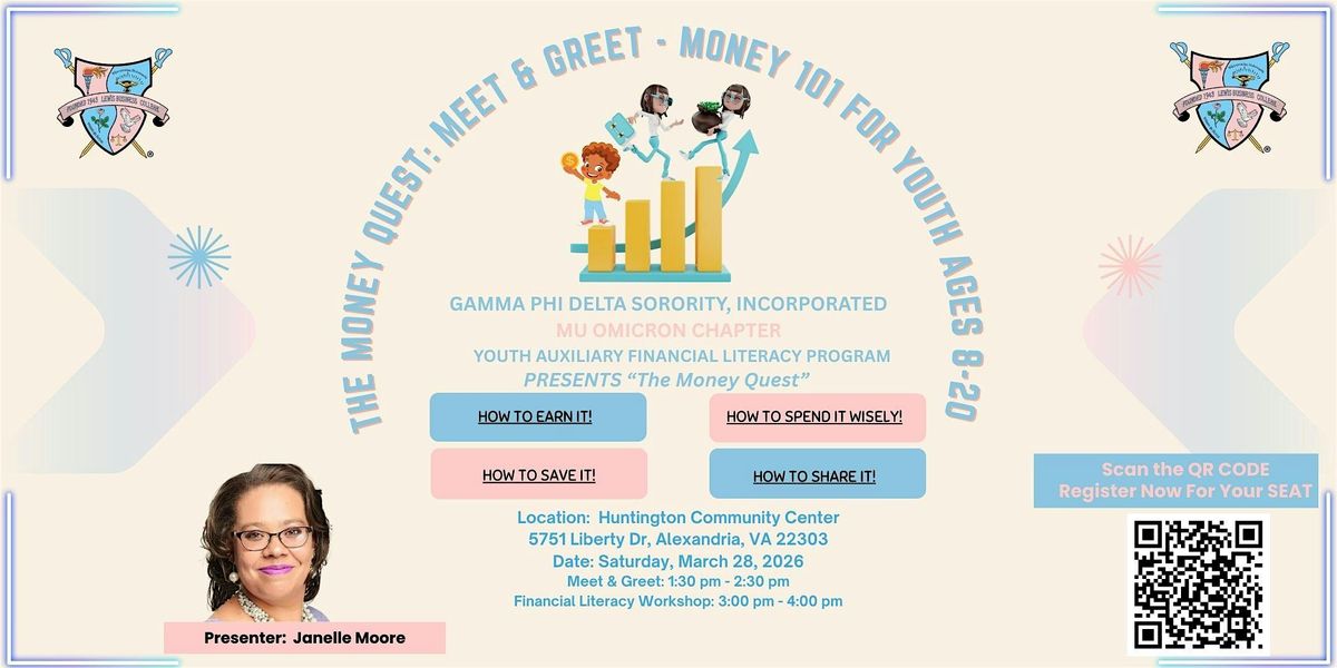 Join us at 5751 Liberty Dr., Alexandria, VA 22303, for an action-packed day of money smarts and real-world tools to build your financial future. Learn how to earn, save, spend smart, and give back — with hands-on tips, expert advice, and free resources. Space is limited — register now to grab your spot! ONLY 40 SEATS AVAILABLE!