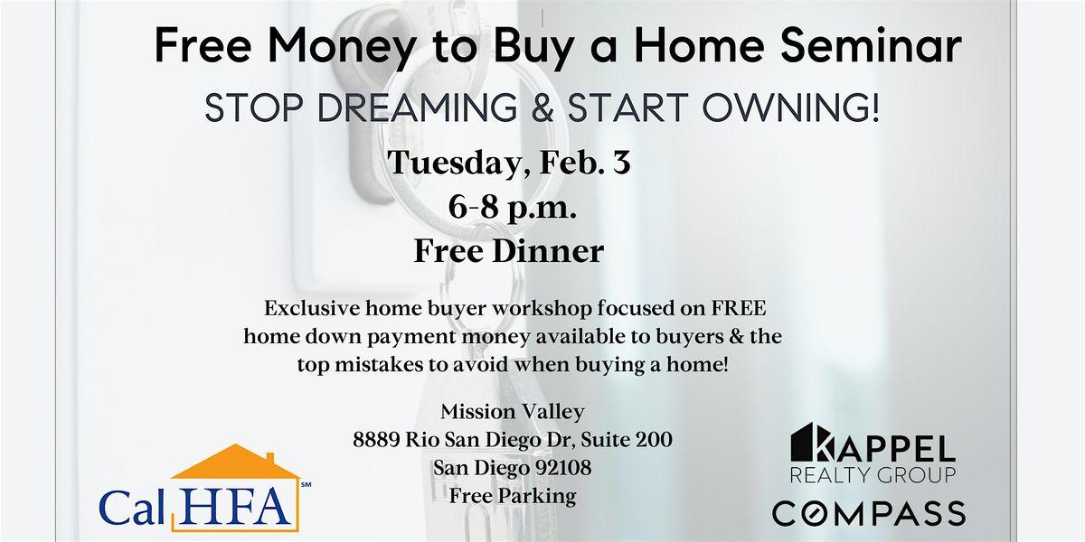 - FREE MONEY to buy a home - most realtors and lenders don't know how to access these programs. We specialize in down payment assistance and how we can help you buy your first home with very little money out of your own pocket. Representative from the California Housing Finance Authority will provide details on all the programs available to you.