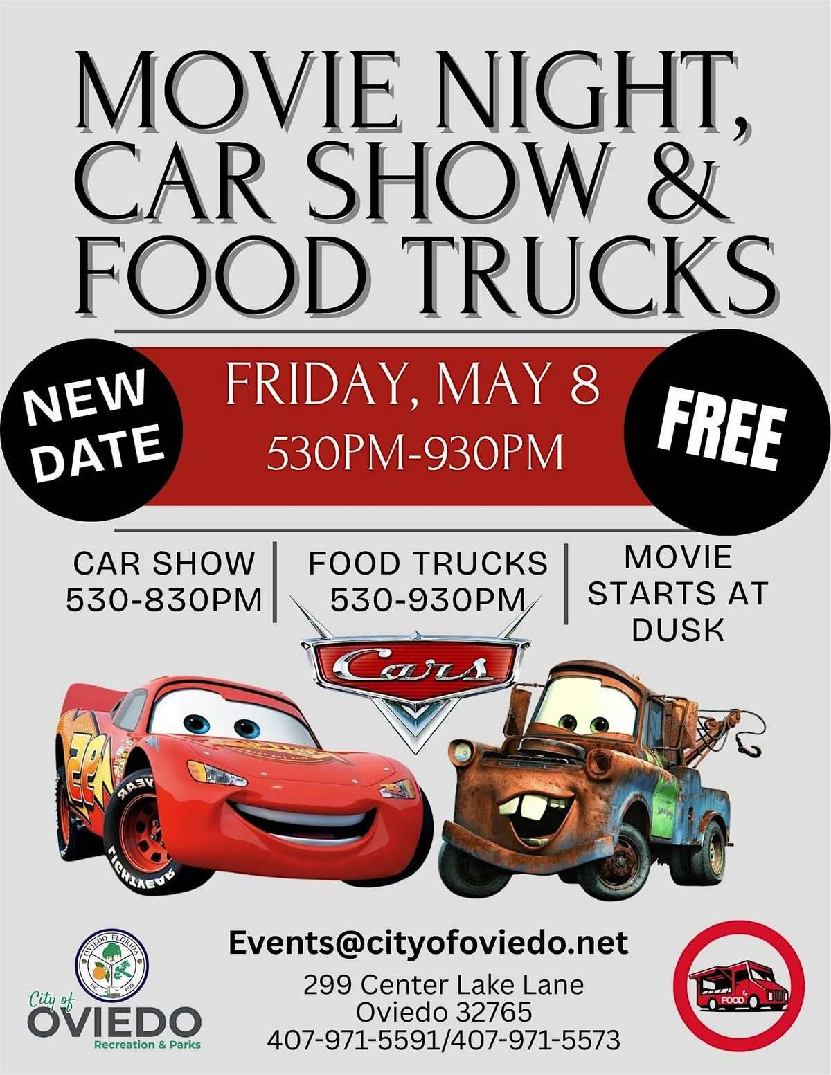 Join us for our FREE movie, car show and food truck night featuring the movie CARS. The Car Show and Food Trucks start at 530p and the movie will be shown on the amphitheater lawn starting at dusk (approximately 8p). Get dinner from a food truck and grab your spot on the lawn...don't forget your blanket or chairs. Our concession stand will also be selling popcorn and treats on the amphitheater lawn.