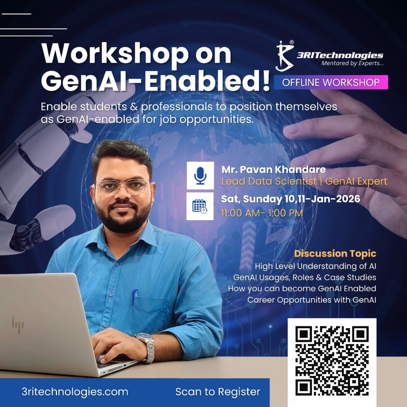 3RI Technologies is conducting a Free Offline Workshop on Generative AI (GenAI) designed for students, freshers, and working professionals who want to understand how GenAI is shaping today’s technology landscape.