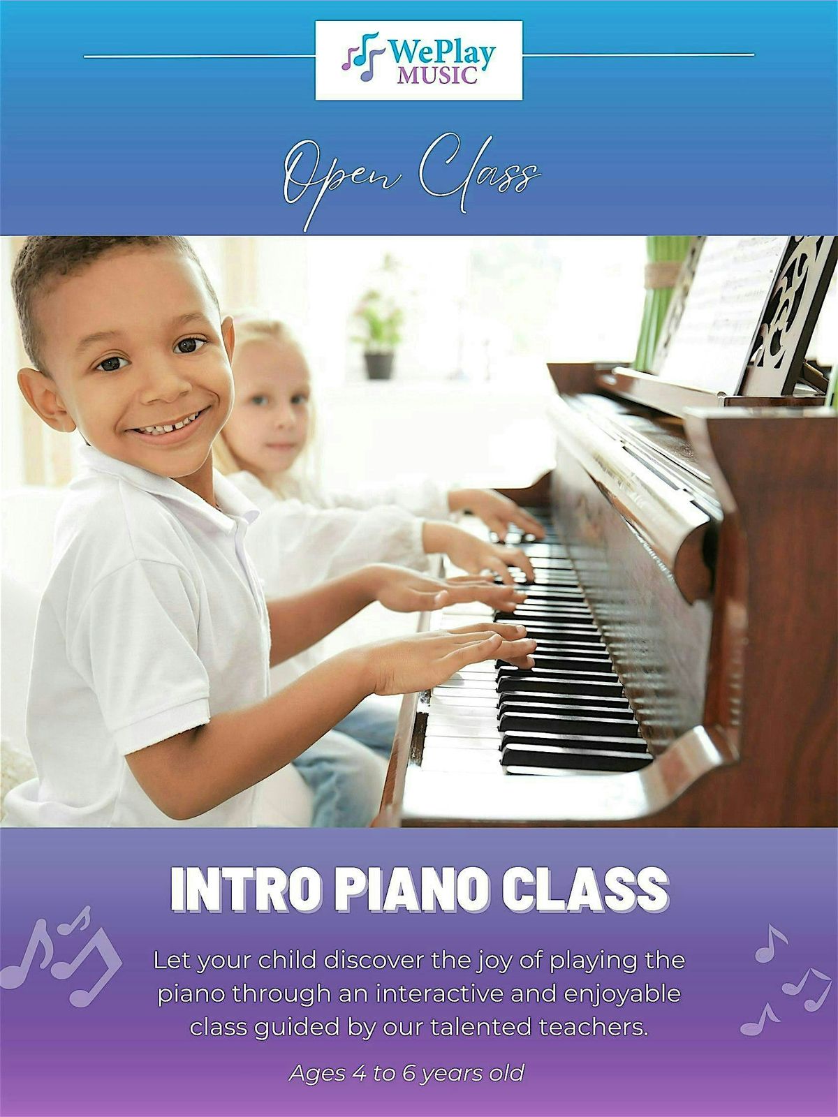 Our Intro Piano Class is the perfect first step into the world of music. Young musicians ages 4–6 years old will explore the fundamentals of piano playing alongside their peers—from finding their first notes to playing simple melodies—all while building confidence and developing a love for music. With guidance from our experienced teachers, each class is fun, engaging, and supportive, ensuring every child feels encouraged on their musical journey.