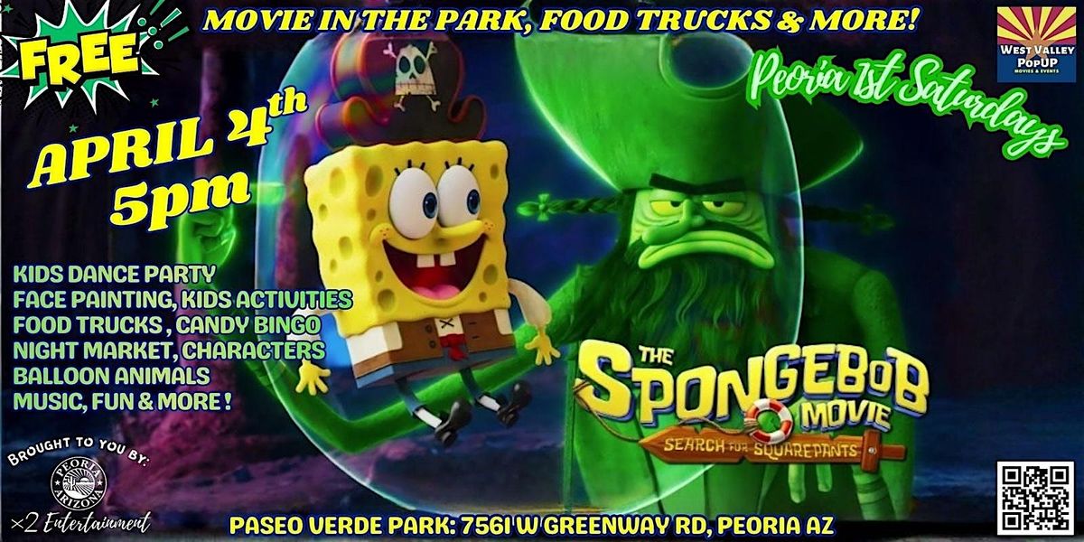 🆓FREE to Enter - 🆓FREE to Park - 🐶🐶Pet friendly - Open to the public-Bring the whole family for the final Peoria 1st Saturdays FREE Monthly Movies in the Park of the 25/26 season featuring featuring 🎥THE SPONGEBOB🧽MOVIE-SEARCH FOR SQUAREPANTS!! But don't worry, we'll be back in Sept for the 26/27 season!