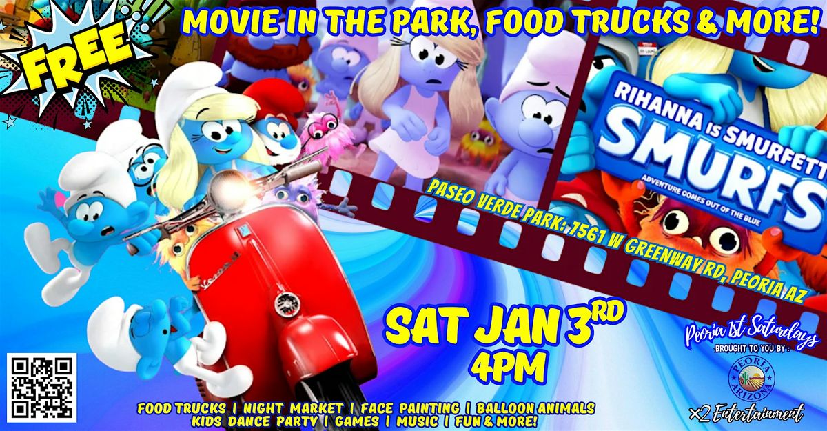 Kick off 2026 with a bang!! Always ?FREE to Enter - ?FREE to Park - ??Pet friendly - Open to the public**Bring the whole family to Peoria 1st Saturdays FREE Monthly Movies in the Park featuring?Paramount's timeless tale...THE SMURFS!!!