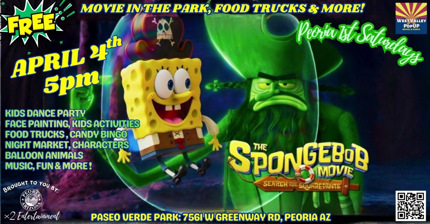 Grab a blanket, chair and your family & friends for a Free Movie in the Park!! only @ Paseo Verde Park (7561 W Greenway Rd, Peoria AZ 85381) featuring THE SPONGEBOB MOVIE-SEARCH FOR SQUAREPANTS!!