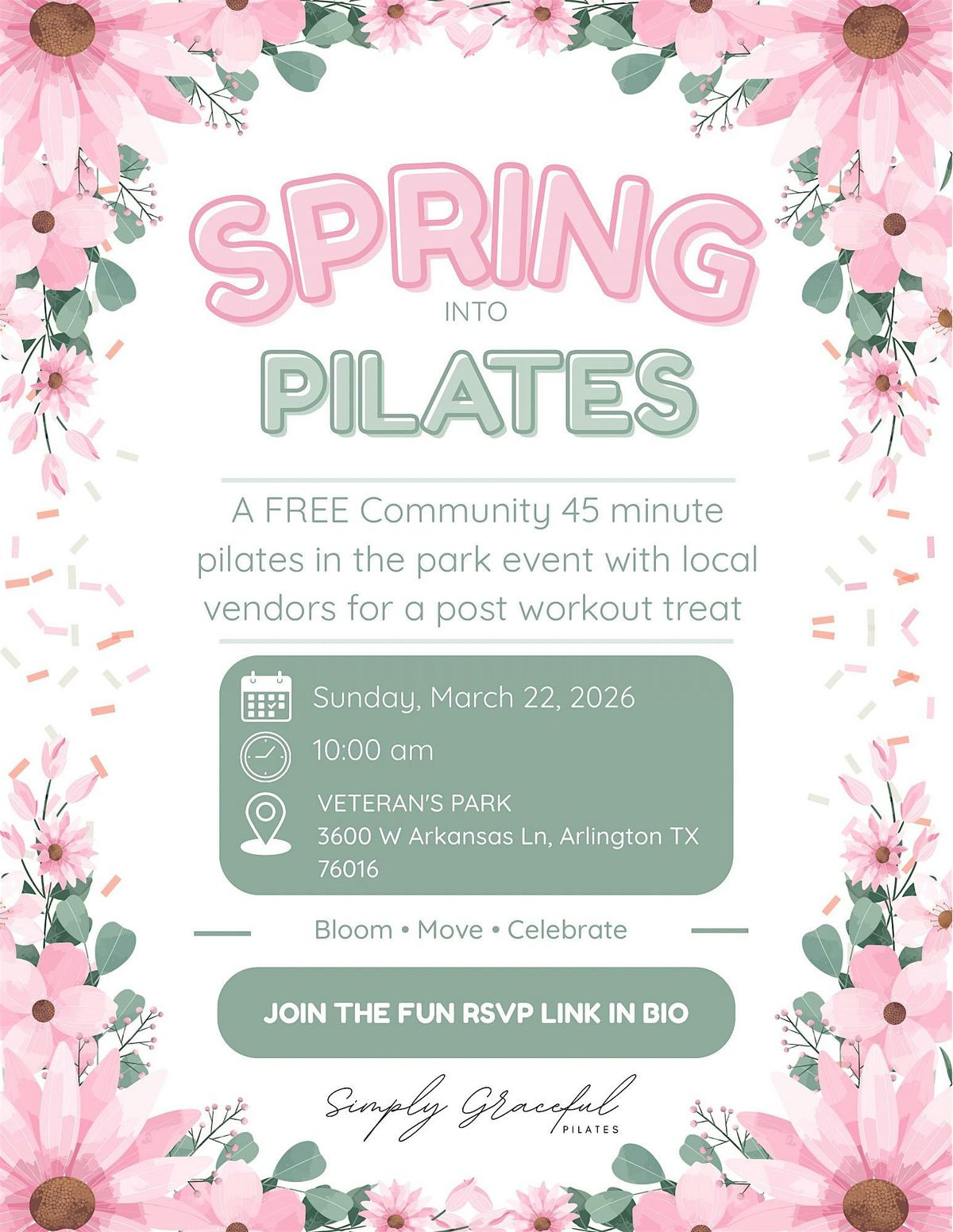 Join us for a fun and energizing 45 minute Pilates session at Veterans Park! Whether you're a beginner or a pro, come enjoy some fresh air and good vibes on March 22, 2026 at 10:00 AM
