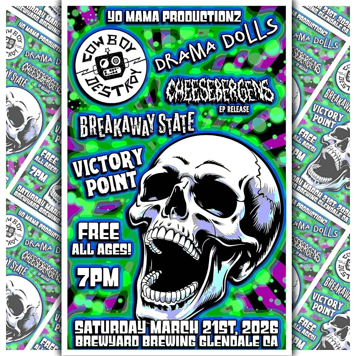 Breakaway State, Cowboy Destroy, Drama Dolls, Cheesebergens, & Victory Point deliver a night of solid Punk energy, food, & drinks!About this Event