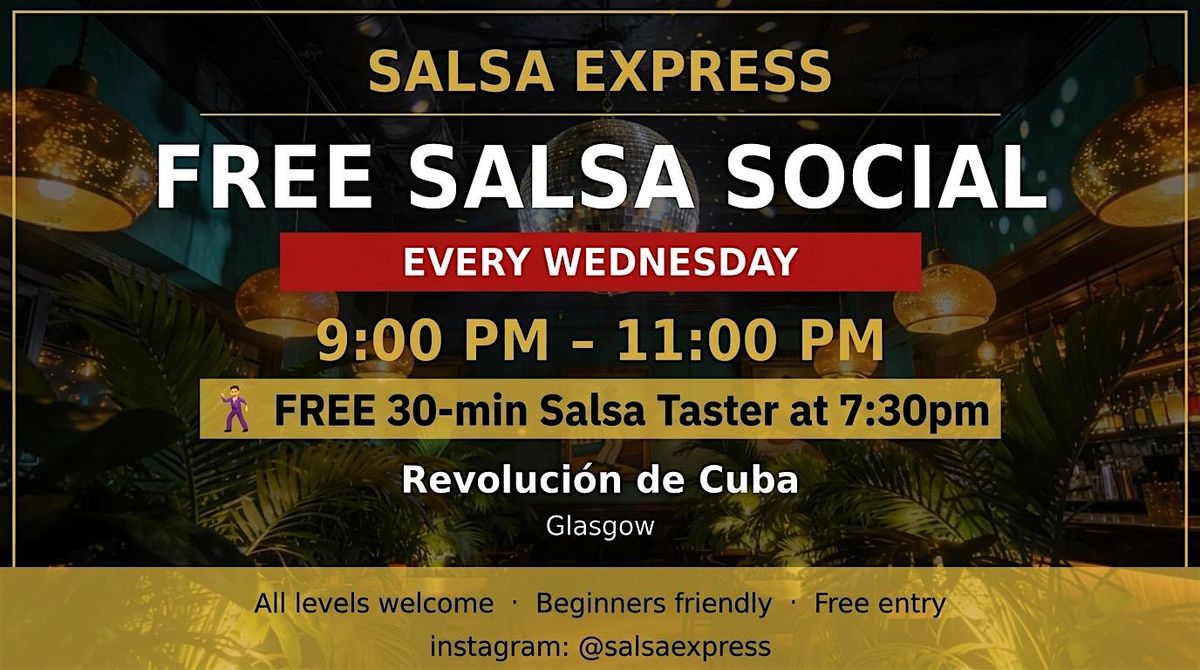 Join us for a free salsa social at the iconic Revolución de Cuba in Glasgow! Whether you’re a complete beginner or a seasoned dancer, come along and enjoy a night of NY On2 salsa in a stunning Latin atmosphere. No partner needed. No booking required — just show up, dance, and have fun.