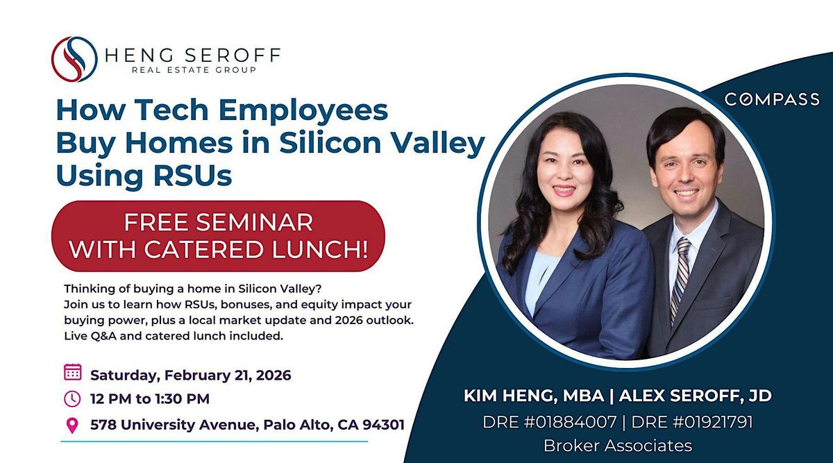 Buying a home in Silicon Valley is different for tech employees. During this in-person seminar, we will walk through how RSUs, bonuses, and equity compensation are evaluated by lenders when buying a home, presented by a top local Silicon Valley lender. Kim Heng will also share a 2025 Silicon Valley housing market update, along with insights into what to expect in 2026. There will be time for live Q&A. Catered lunch is provided.