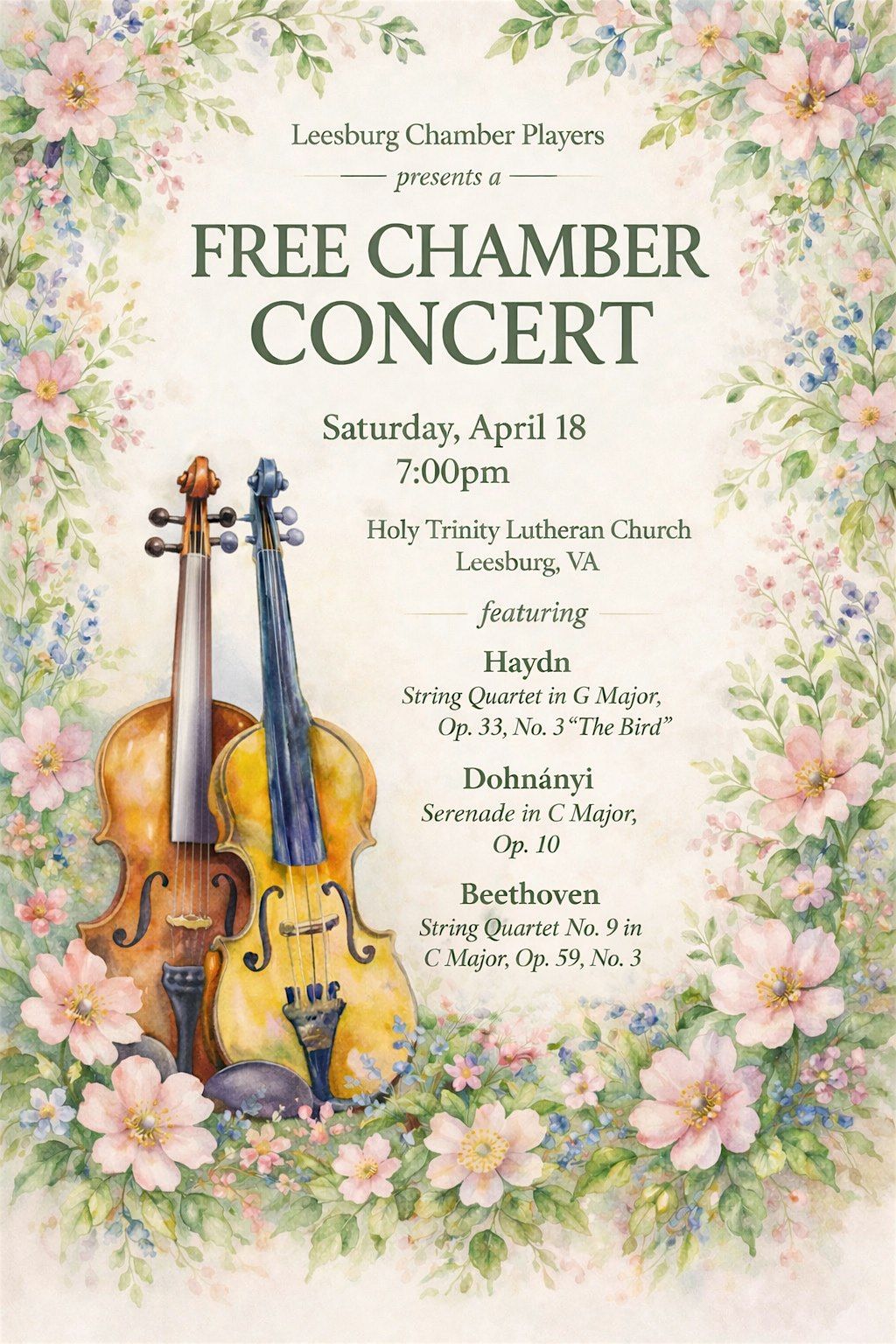Leesburg Chamber Players present the 4th concert of our 2026 season: Haydn, Dohnanyi and Beethoven. Beauty, excitement and informality.