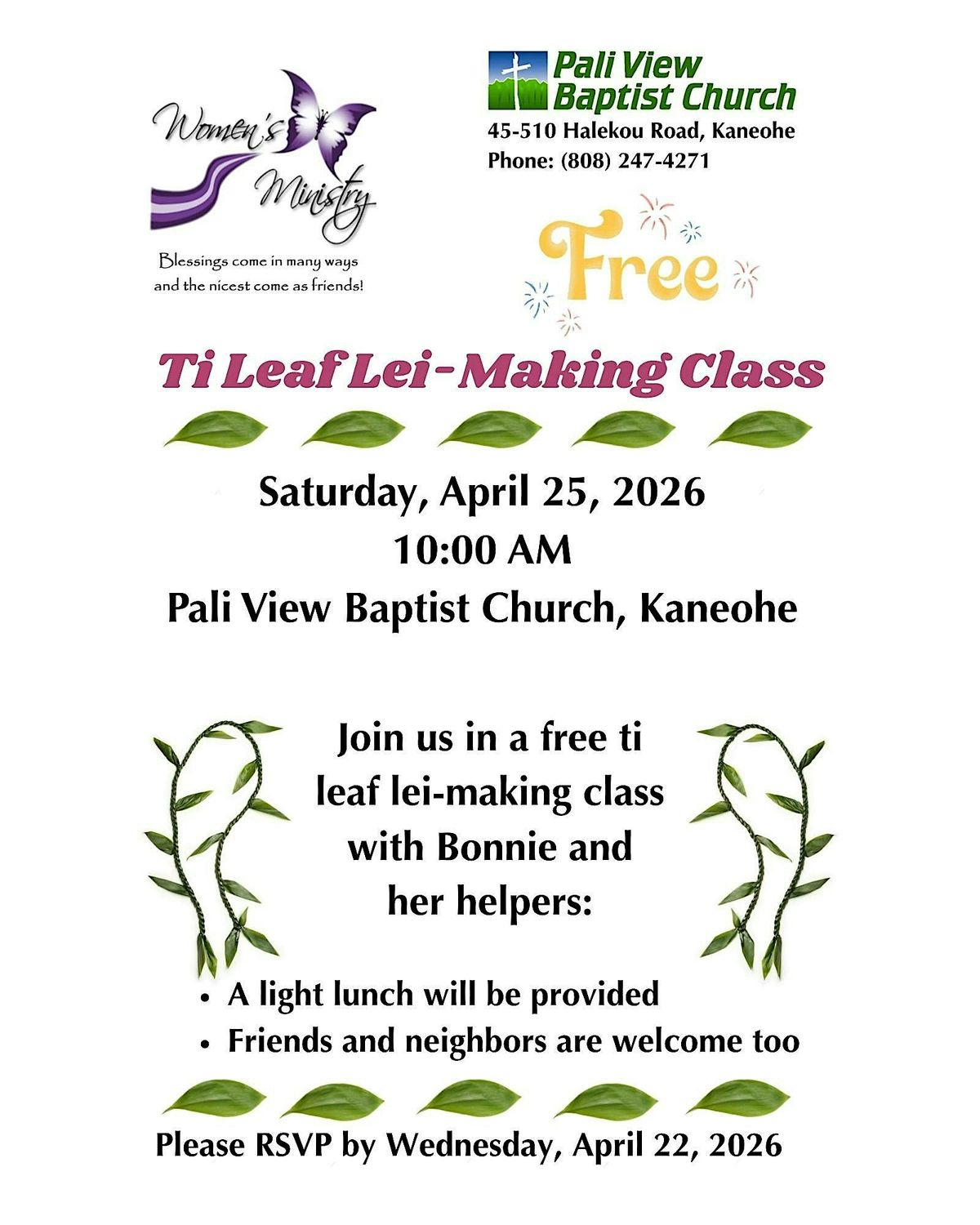 The Women's Ministry FREE ti leaf lei-making class has rescheduled to Saturday April 25, 2026, at 10AM. Sign up to reserve your seat(s).About this Event