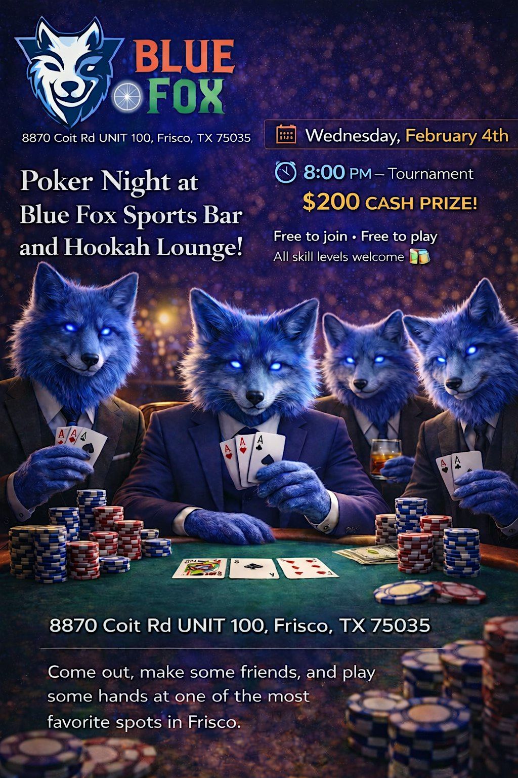 ♠️ Poker Night at Blue Fox : Sports Bar - Restaurant - Hookah Lounge ! ♣️ 📅 Wednesday, February 4th � Blue Fox : Sports Bar - Restaurant - Hookah Lounge! — 8870 Coit Rd UNIT 100, Frisco, TX 75035 Join us for an exciting night of cards, community, and cold brews 🍻 We’re hosting a FREE poker tournament: 🕖 8:00 PM — Tournament Free to play ✅ All skill levels welcome — New members are encouraged to join the fun! Whether you’re a seasoned player or just curious, come out, make some friends, and play some hands at one of Frisco's favorite spots.