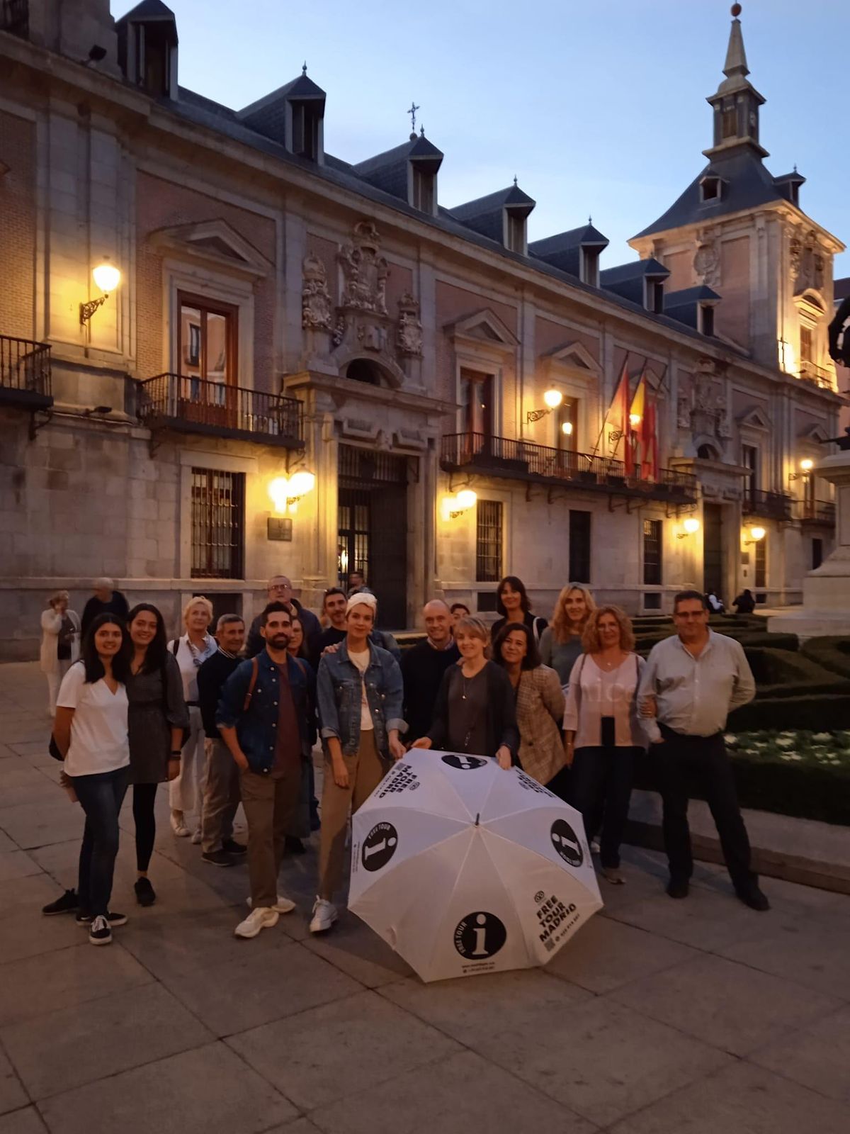 Delante de la oficina de información turística bajo los paraguas blancos, Plaza Mayor de Madrid, 27, Madrid, Spain