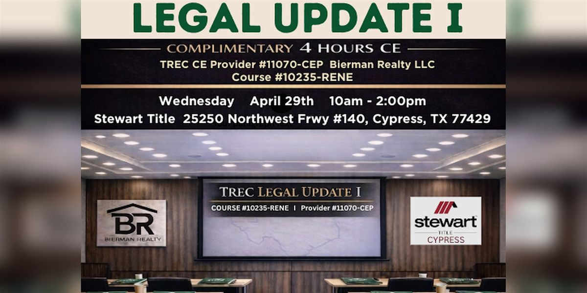 Join us in person at Stewart Title - Cypress TX for this complimentary Legal Update I class. Breakfast/Lunch provided. 9:30am Check-InAbout this Event