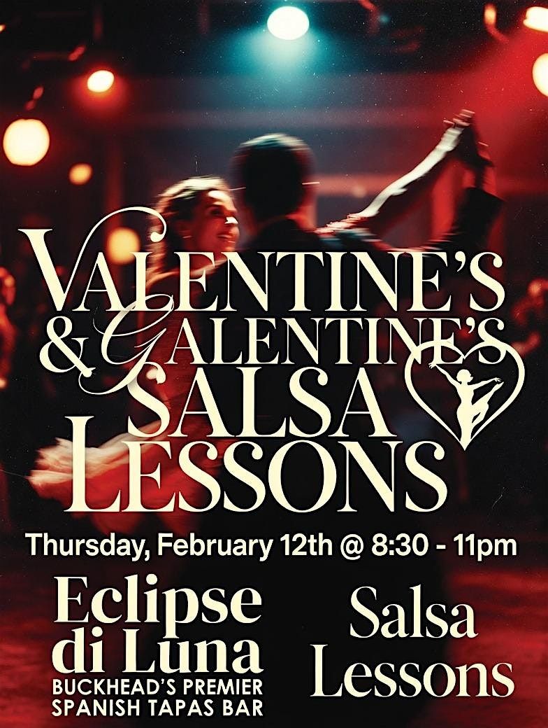 Join us for an energetic evening of **Valentines Salsa Dance Lessons** at Eclipse di Luna, Buckhead! Get ready to groove to a **live band** while enjoying delicious **tapas**. Don't miss out on this opportunity to show off your best dance moves and mingle with fellow salsa enthusiasts. With great food, great fun, & great drink specials, it's going to be a night to remember! This event is great for couples, singles, and galentines events!
