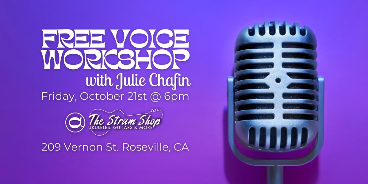 All ages and all levels welcome! Workshop will include breath control information and instruction as well as vocal exercises and a sing-a-long round. The workshops instructor, Julie Chafin has trained in vocal workshops and private lessons with various world-class musicians, including: Irene Dalis (New York Metropolitan Opera Star), Bobby McFerrin (Don’t Worry Be Happy), Todd Schroeder (Disney Instrumentalist), Gunnar Madsen (The Bobs), Tito Capobianco (General Director of the San Diego Opera), and more. Julie recived her B.A. Music (Jazz/Voice) from San Jose State University (SJSU), San Jose, CA in 1982. She is one of two original graduates in the Jazz/Voice Major at SJSU and has taught piano, flute, and voice for over 30 years.