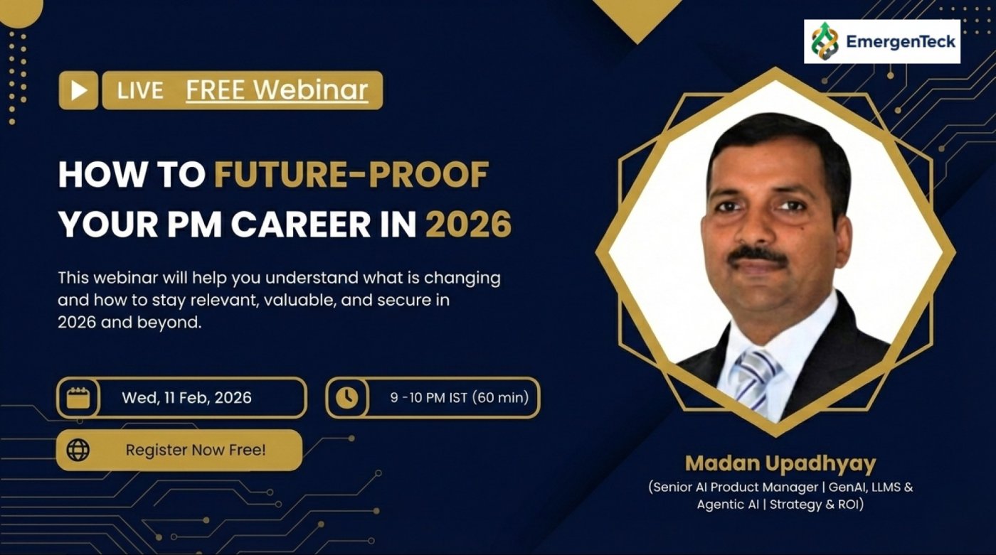 EmergenTeck invites you to a live webinar on “How to Future-Proof Your PM Career in 2026”, designed for Project Managers, Delivery Managers, Scrum Masters, and Agile Coaches who want to understand how AI is reshaping project management roles and how to remain relevant, valued, and future-ready in 2026 and beyond. The session will be led by Madan Upadhyay, Senior AI Product Manager with expertise in GenAI, LLMs, and Agentic AI, focusing on AI product strategy, roadmaps, and ROI.