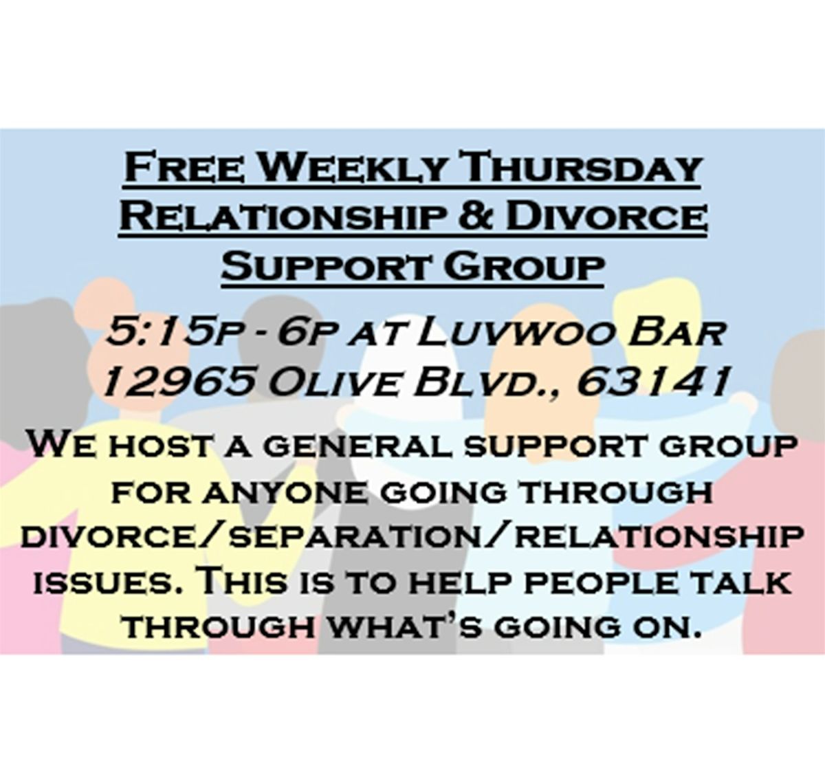 Every week on Thursday from 5:15P - 6:00P at Luvwoo Bar, we host a general support group for anyone going through divorce/separation/relationship issues. This is to help people talk through what’s going on and to know that they are not alone in what they are going through. This is just an open forum get together and discussion. This is free, but we ask that you purchase something during this happy hour timeframe to support the venue! This is open to all ages.