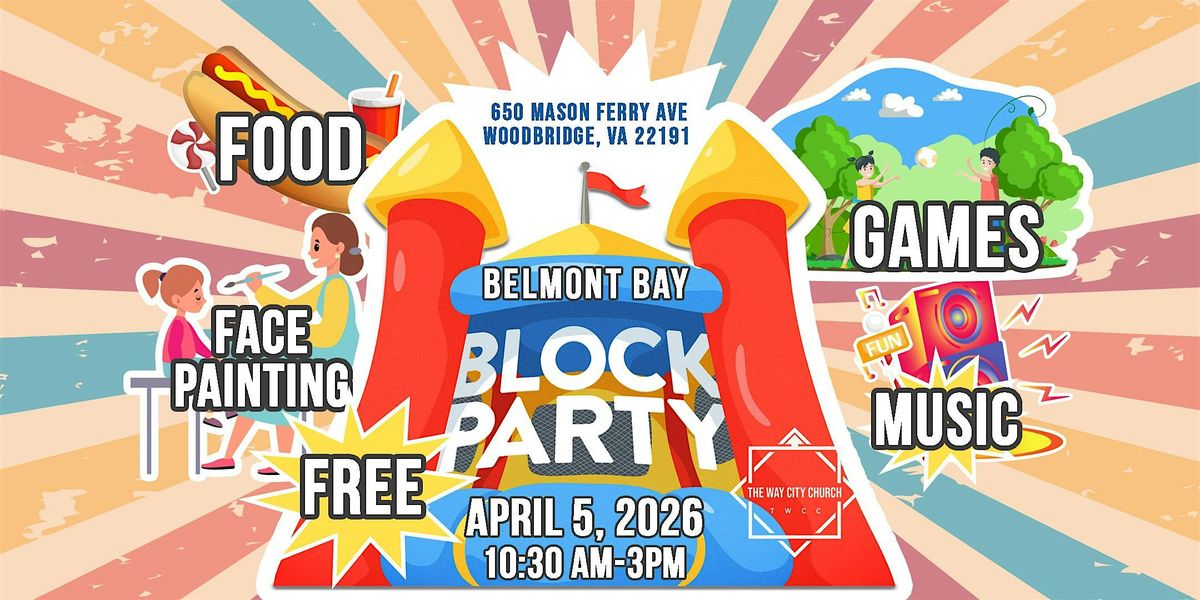 Come join us for an amazing time for the whole family at the Woodbridge Block Party in beautiful Belmont Bay! Get ready for an epic evening filled with free food, music, games, bouncey castles, and more! This is the event you don't want to miss! Bring your friends, family, and neighbors for a fun-filled evening. See you there!