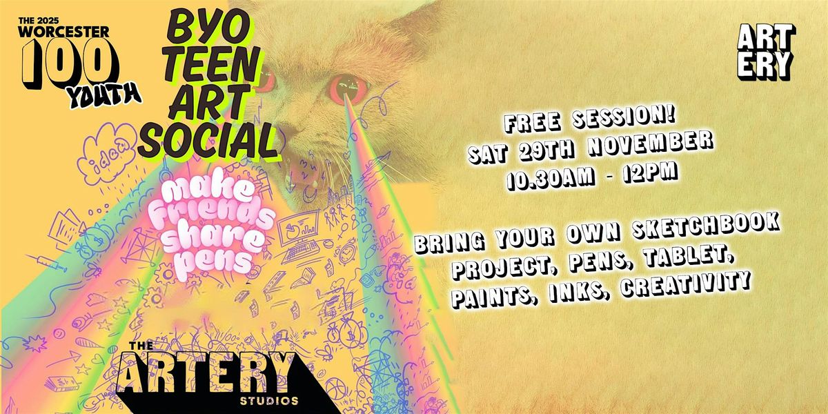 Join us in person for a fun and creative FREE SESSION of our regular Teen Art Social! This workshop is all about hanging out, expressing yourself, and connecting with other young artists in Worcester. Whether you love painting, drawing, or just want to try something new, this is the place to be. Bring your creativity and good vibes. Let’s make some cool art together! Bring your own sketchbooks, projects or something new that you're working on, we'll provide any materials you don't have or need.