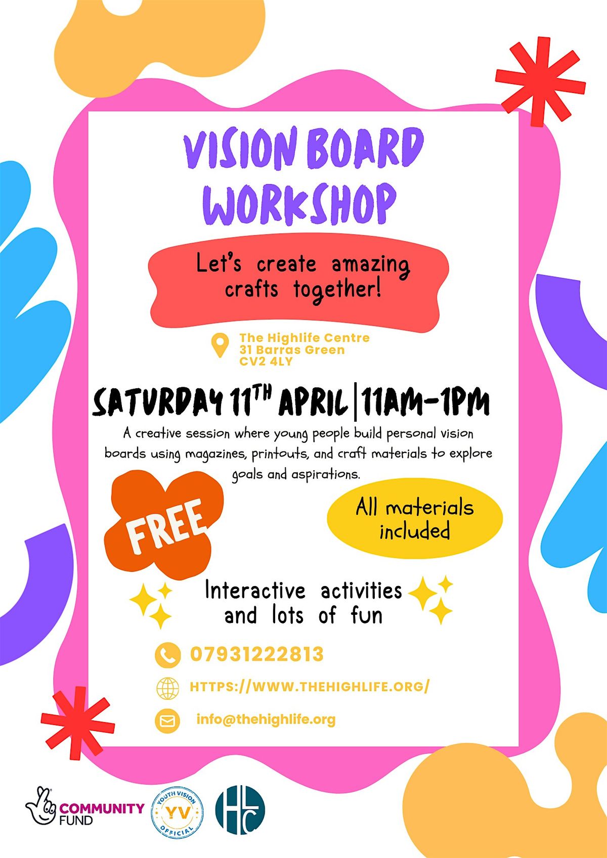 Hey there! Join us in person for the "Make your own Vision Board" workshop. It’s a fun, creative space where you can bring your dreams to life, plan your future, and get inspired alongside other young folks. Don’t miss this chance to visualize your goals and make them real. See you there!
