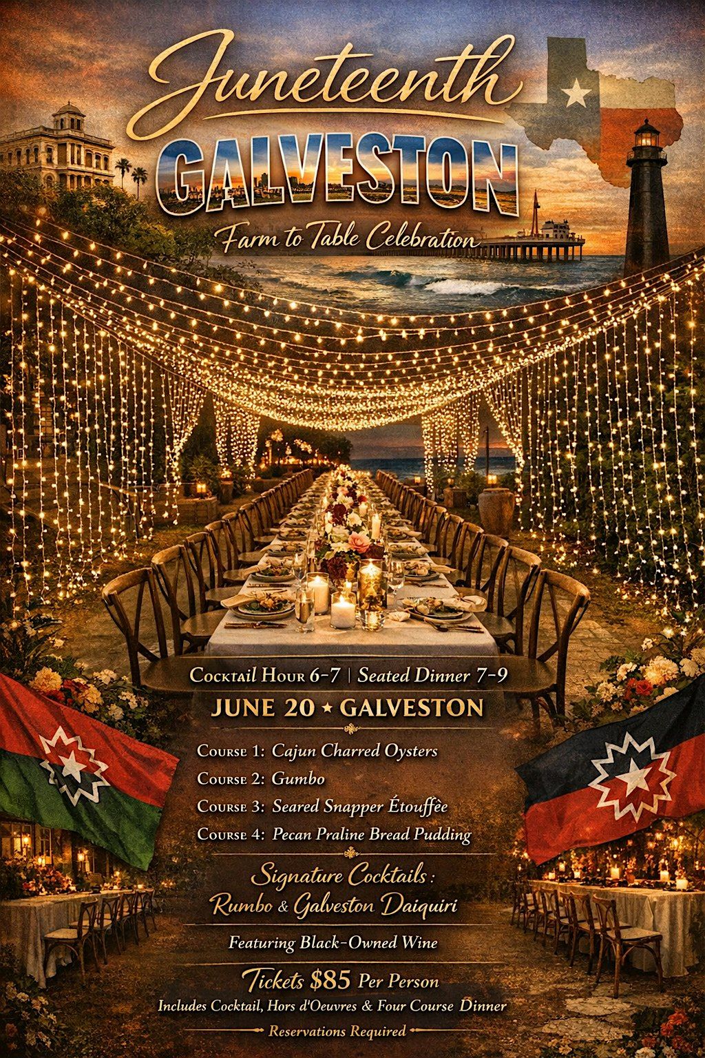 This special night pays tribute to Galveston, Texas — where Juneteenth began — through a thoughtfully curated four-course menu rooted in Gulf Coast flavors, Louisiana-style influences, and Southern culinary tradition, all presented in an intimate, candle-lit, elevated dining setting.