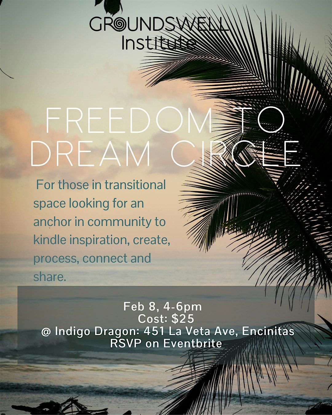 Life transitions can lead to personal transformation! If you are navigating any life transition from job, relationship, place, way of being, or season...this workshop is for you! This women's circle will guide you through time of personal reflection, expressive arts, and community.