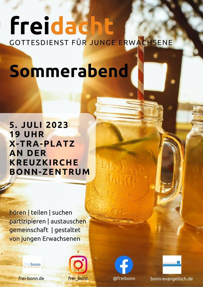 Was braucht es für einen gemütlichen Sommerabend? Nette Leute und kühle Getränke, klar.Das möchten wir dir am 5. Juli um 19 Uhr mit dem freidacht-Gottesdienst auf dem XTRA-Platz vor der Kreuzkirche bieten.
