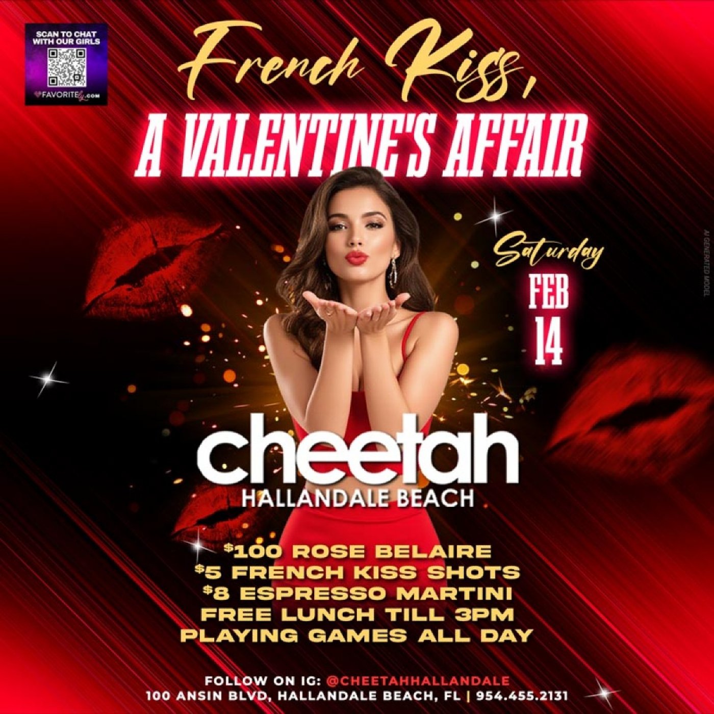 Saturday, February 14th, Celebrate Valentine's the Cheetah way w/ a romantic, high energy vibe all day & night. Enjoy $100 Rose Belaire, $5 French Kiss Shots & $8 Espresso Martinis, plus free lunch till 3pm. Games will be going all day, so come early,stay late and make a valentine's to remember,