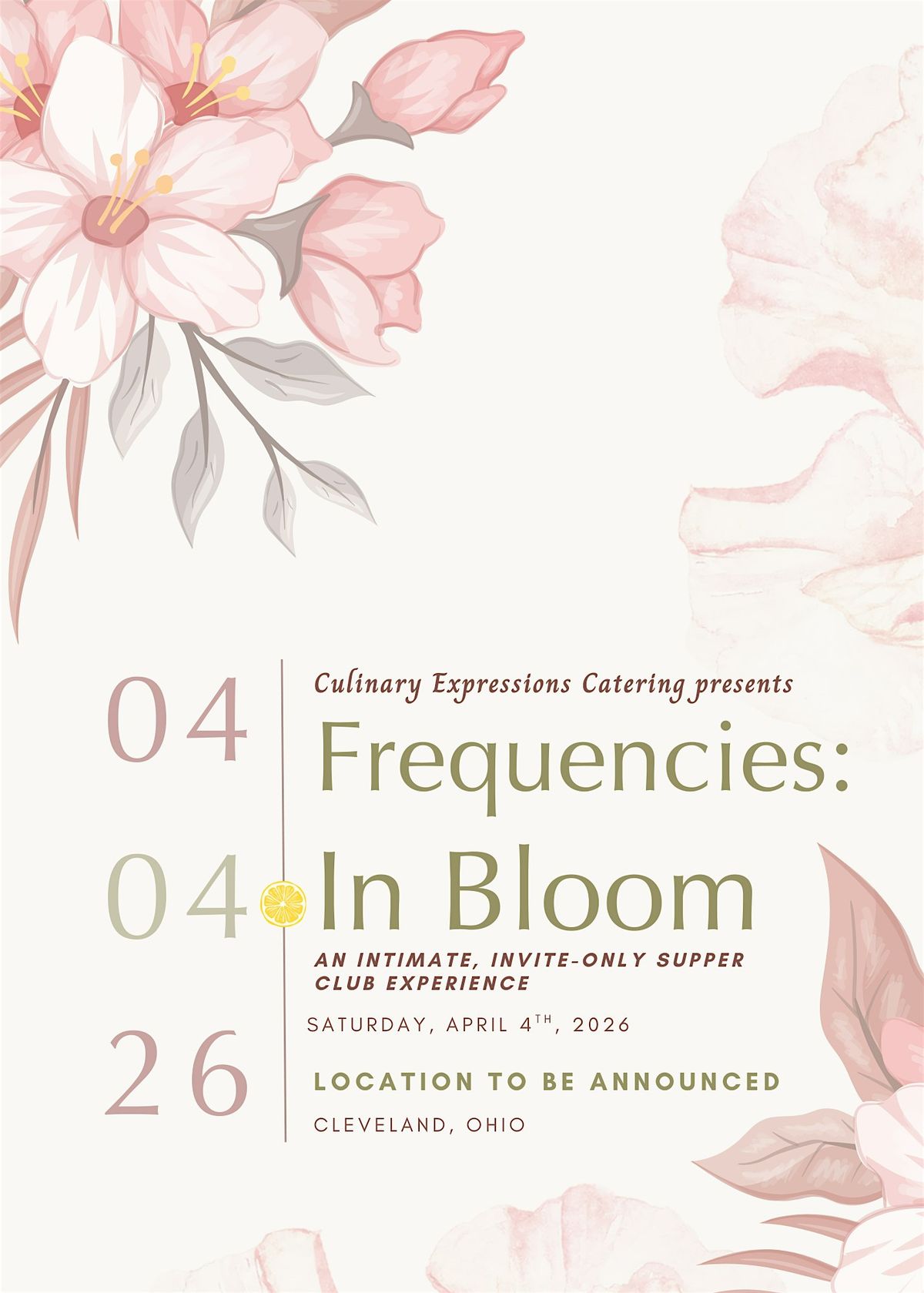 Join Chef Antonia Eddie for Frequencies: In Bloom, an intimate spring supper club designed to celebrate the beauty, rhythm, and renewal of the season. This carefully curated dining experience brings together seasonal ingredients, thoughtful plating, and warm hospitality in an atmosphere meant for connection and conversation.
