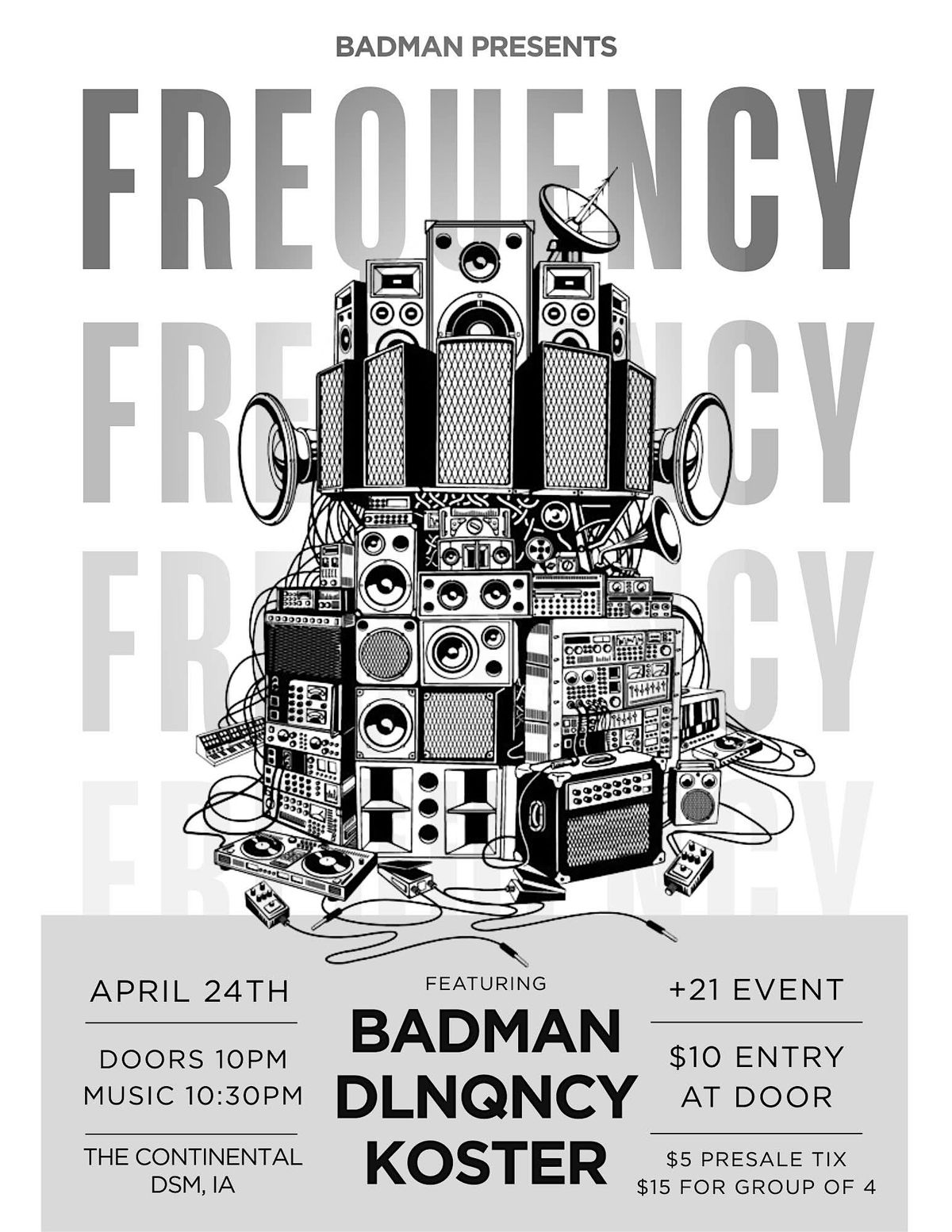 DES MOINES — lock in April 24th.FREQUENCY at The Continental with Badman, DLNQNCY, and Koster bringing the bass all night.