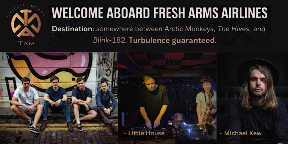 Welcome aboard Fresh Arms Airlines — your South London indie rock redeye, piloted by a Californian frontman and three Brits serving fast riffs, loud nights, and zero legroom.