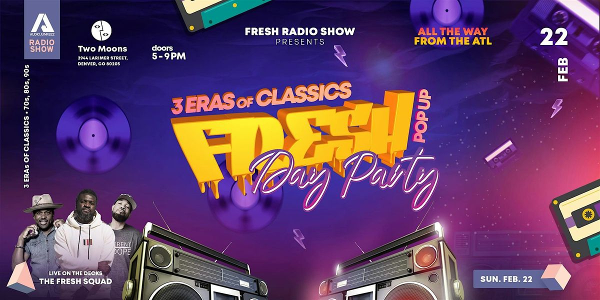 ATL's own FRESH DAY PARTY '3 ERAS OF CLASSICS' is coming to DENVER, CO. FOR 1 DAY ONLY!!! ARE YOU READY TO DANCE THROUGH 3 ERAs OF CLASSICS, FRESH STYLE? FRESH IS GIVING YOU 3 ERAs OF CLASSIC HIP HOP, RNB, DANCEHALL PLUS MUCH MORE NOSTALGIC CLASSICS FROM THE 70s, 80s, & 90s! I HOPE YOU ARE READY TO ROCK TO THE SONGS YOU KNOW AND LOVE! FRESH DAY PARTY IS HAPPENING IN DENVER, CO. on SUN. FEB 22ND at TWO MOONS MUSIC HALL from 5-9p.