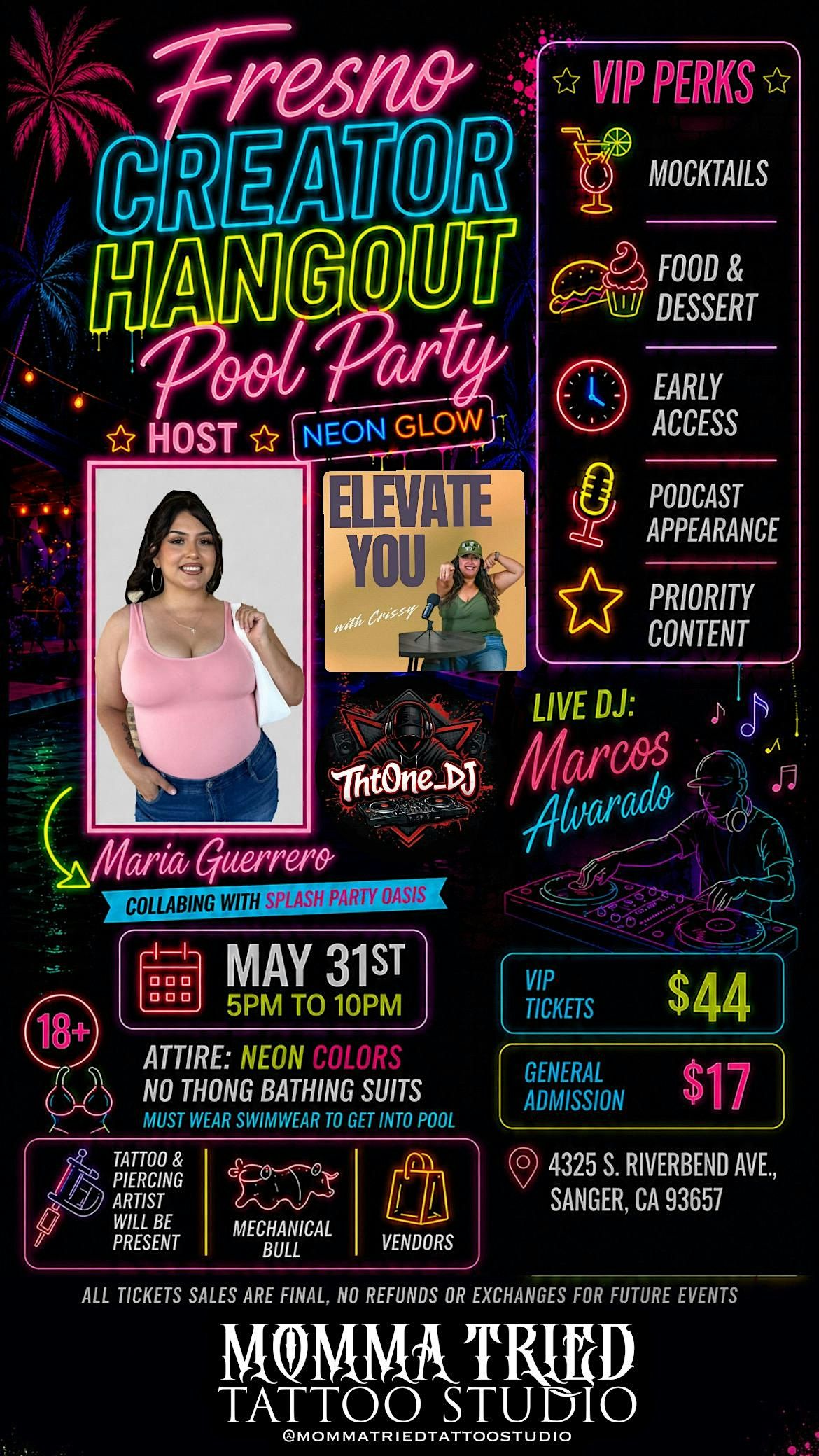 Fresno Creators Hangout Pool Party 🎉Hosted by local influencer Maria Guerrero, founder of Fresno Creators Hangout, this event is all about bringing together creators, influencers, and businesses for a night of networking, content creation, and unforgettable vibes. Join us at Splash Party Oasis for a high-energy pool party experience featuring a neon glow theme ✨ Dress code is strictly enforced: neon colors, swimwear required to enter the pool (no thongs). This is an 18+ event and a valid ID is required. Come ready to record content, connect, and grow your platform 📸 There will be mini pop-up vendors, a live DJ, and a podcast setup on-site, giving you the opportunity to be featured and gain exposure.